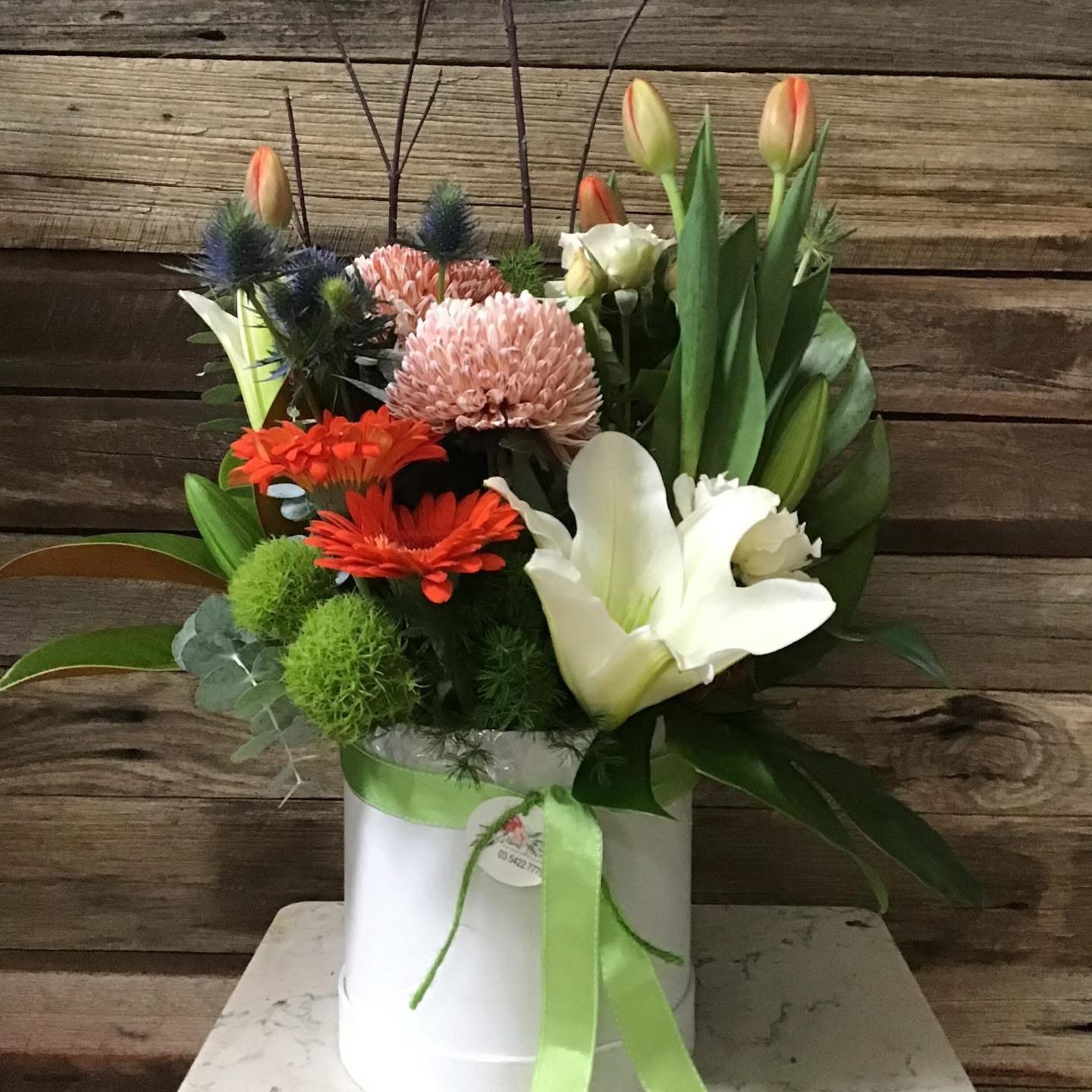 Each arrangement is created using seasonal blooms, selected based on availability at the time of your order.